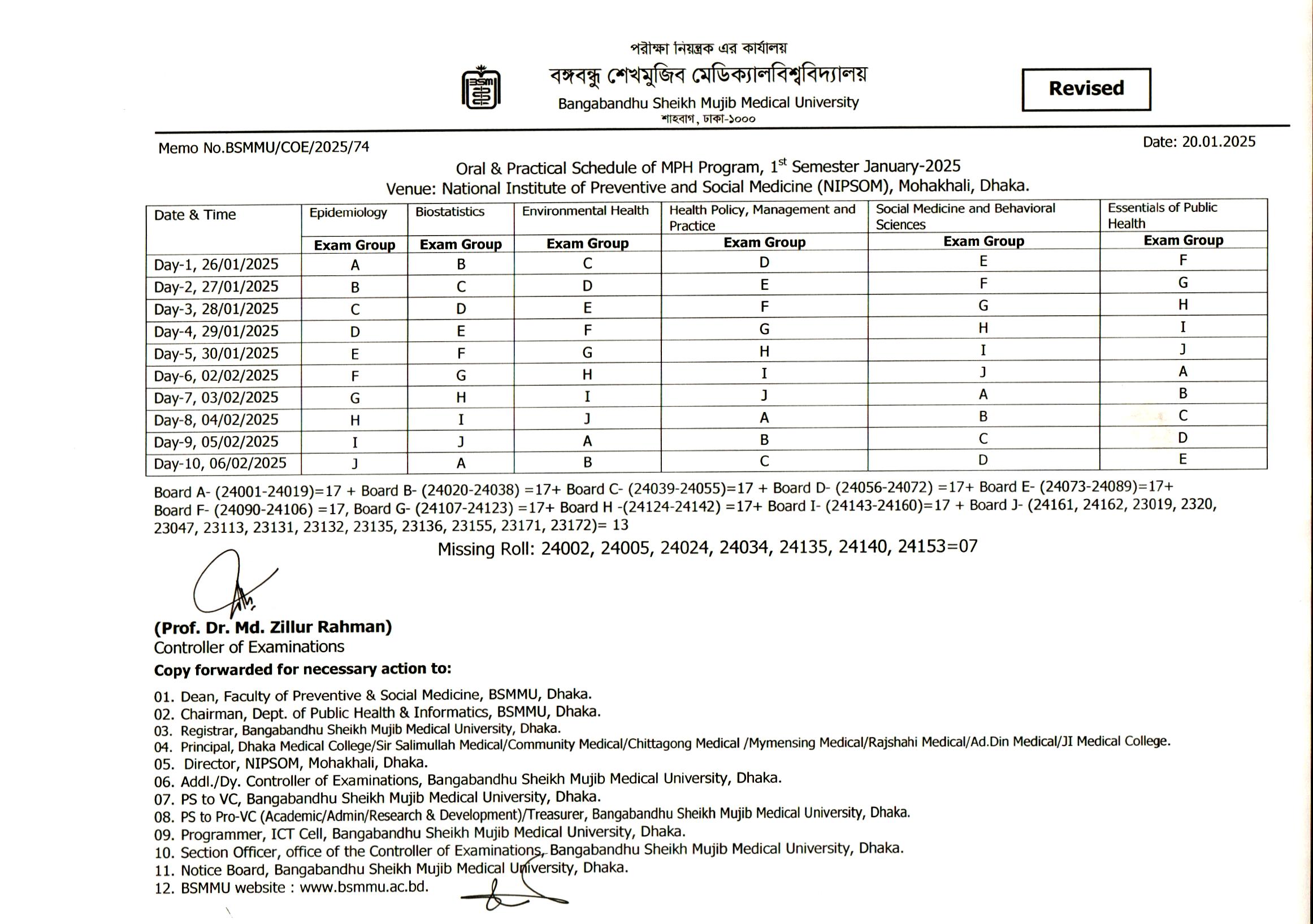 Revised Schedule of Oral & Practical Examinations of MPH Pragram 1st semester January 2025